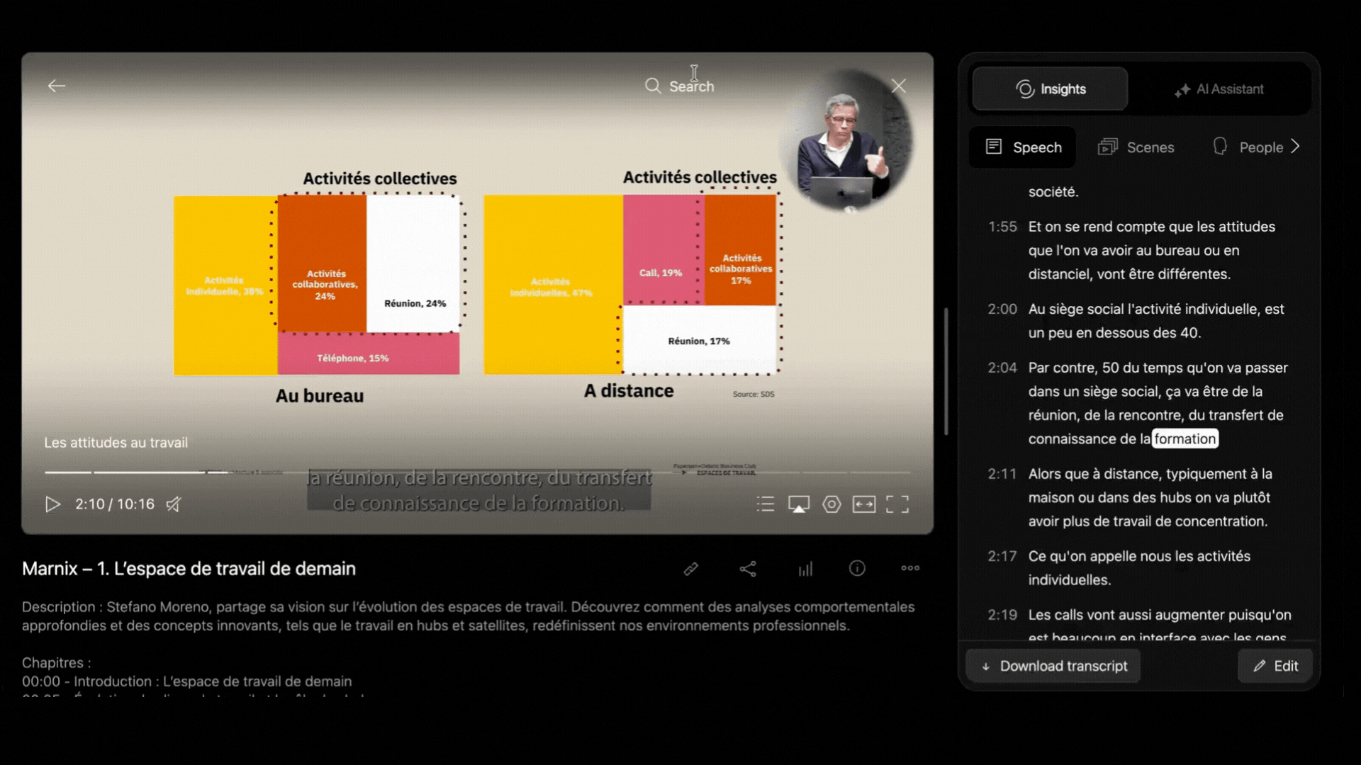 Simply type a keyword to find every moment where it’s mentioned, across all your videos, with instant timestamps, subtitles, and chapters.